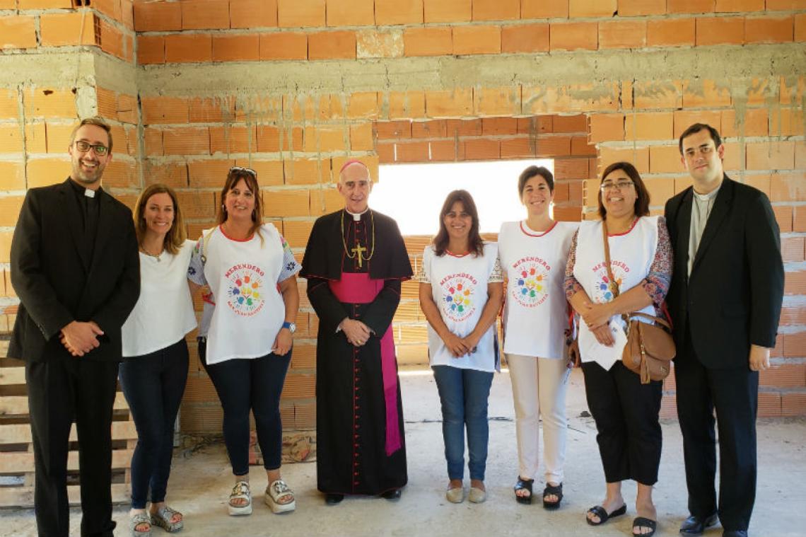 El obispo visitó el sitio donde se está levantando el Merendero que actualmente funciona en el Jardín de Infantes “San Juan Bautista”, todos los sábados de 16 a 18. En este momento, se está levantando un SUM, una cocina y baños. Además de los chicos del barrio, concurren los familiares a tomar la merienda y se les entrega una bolsita para que las familias puedan merendar el domingo.