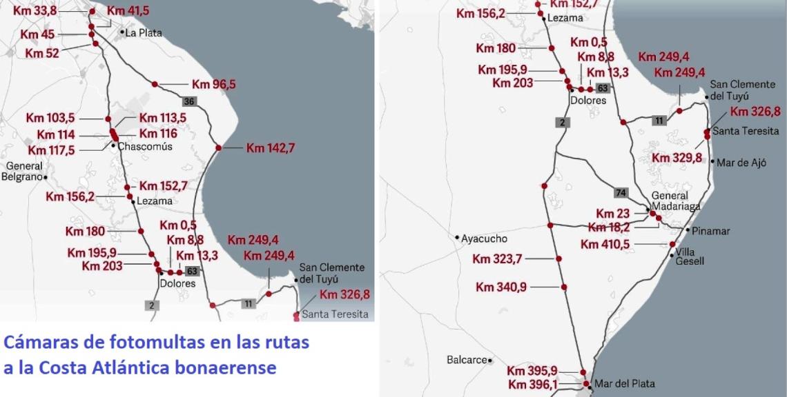 Los que eligen como lugar de descanso la Costa Atlántica bonaerense deben tener en cuenta que las velocidades máximas van de 60 a 130 km/h en las rutas 2, 11, 63 y 74, donde hay más de 70 cámaras de fotomultas que monitorean el exceso de velocidad. Hay 48 radares instalados en la ruta 2 (mano ascendente y descendente), 11 en la ruta 11, 2 en la ruta 36, 5 en la ruta 63 y 6 más en la ruta 74.