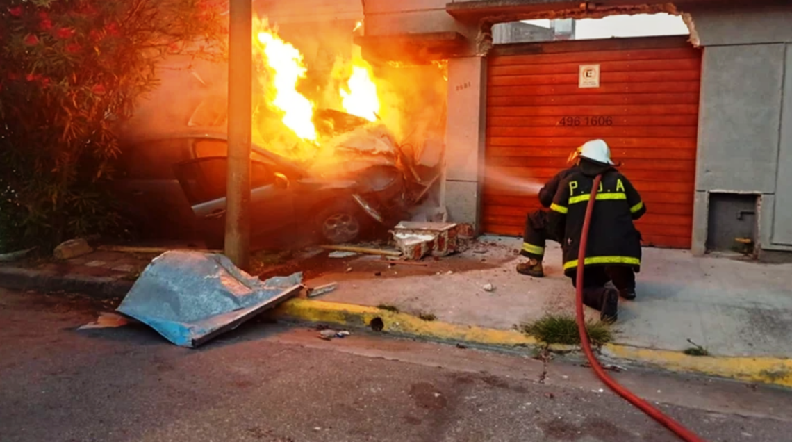 Tras atropellar durante la huida a una ciclista, que fue trasladada al Hospital Privado de Comunidad, el Ford Focus terminó incrustado en el frente de una vivienda. Tras el impacto, el automóvil se presume que sufrió un cortocircuito y se prendió fuego, quedando en pocos segundos envuelto en llamas.